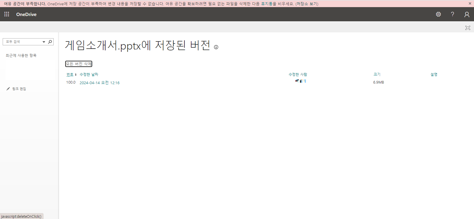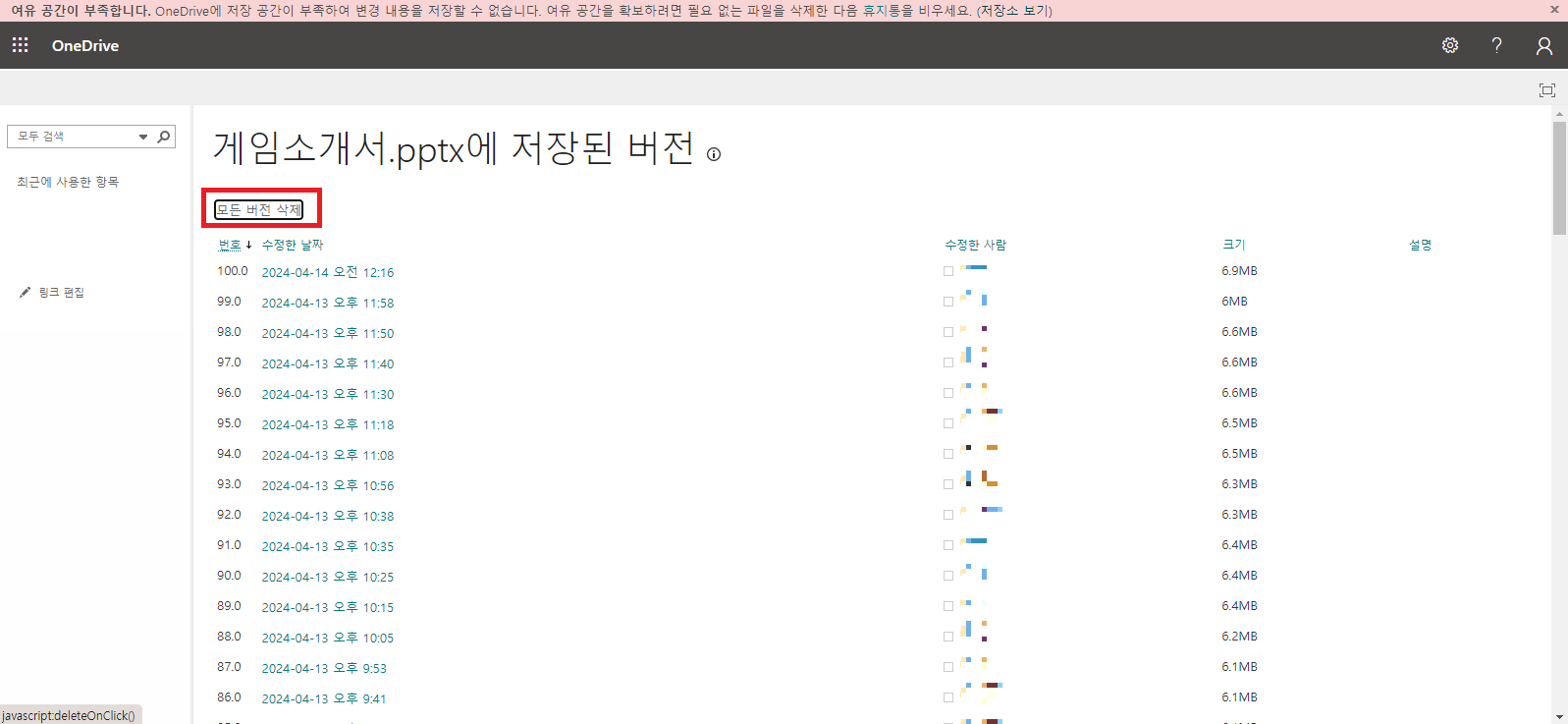 그래서 문서 목록을 봤는데 다 합쳐도 문서 용량은 70MB도 안되어 있기 때문에 어디서 용량을 차지하고 있을까 한참 알아보다가 엑셀, 워드, PPT 문서들의 버전 기록(백업 파일)이 상당한 용량을 차지하고 있다는 것을 알게 되었습니다.