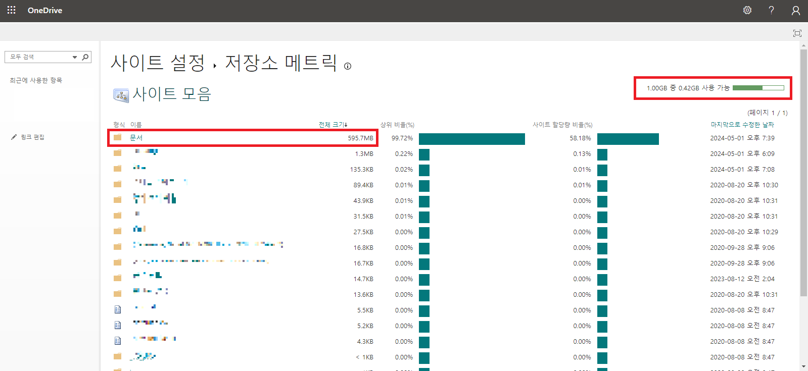 저장소 메트릭에서 전체 용량과 함께 폴더별 사용량도 한눈에 볼 수 있습니다.