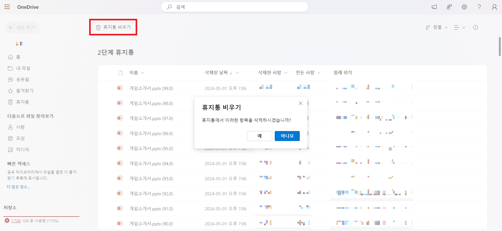 좌상단의 '휴지통 비우기' 버튼을 클릭하여 제거해 줍니다.