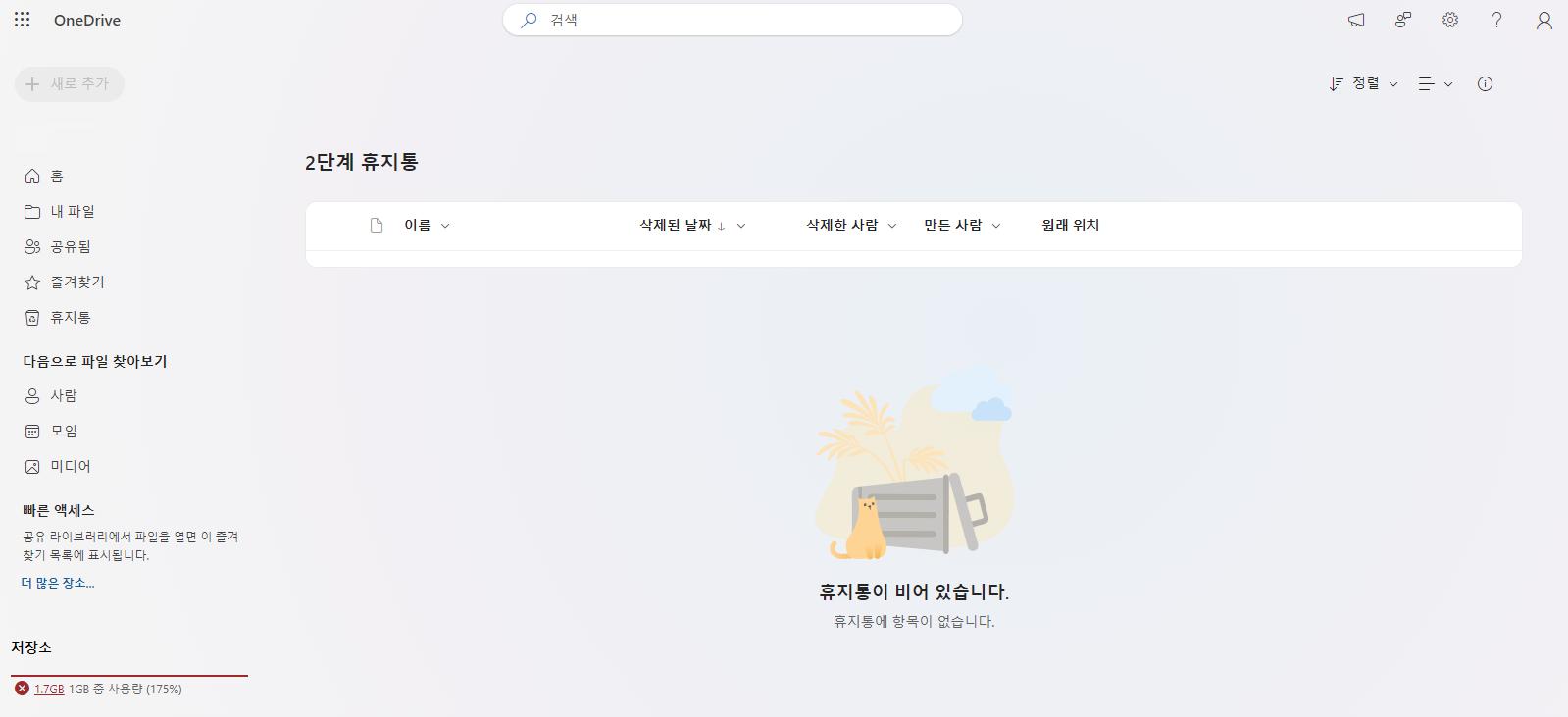 원드라이 페이지로 돌아와서 좌측 메뉴의 '휴지통' 메뉴를 클릭합니다.