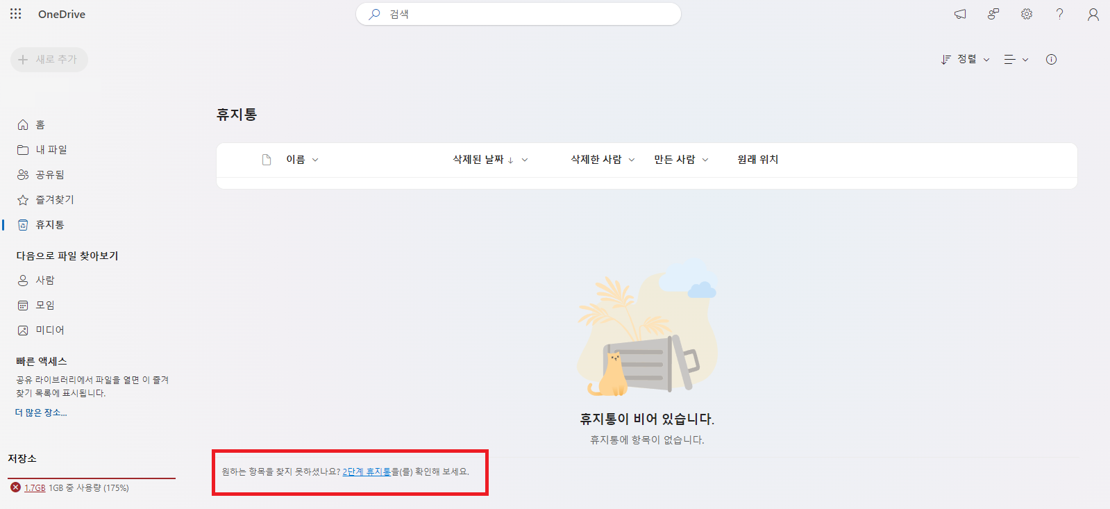 비워진 휴지통 하단의 '2단계 휴지통' 버튼을 클릭합니다.