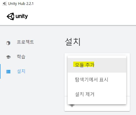 NDK를 찾을 수 없다는 의미인 것 같아서 설치가 안 돼있는지 확인하기 위해 Unity Hub에서 확인합니다.