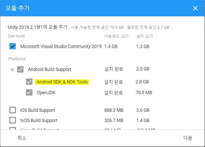 Android SDK & NDK Tools의 체크 박스가 해제되어있다면 체크 후 설치해줍니다.