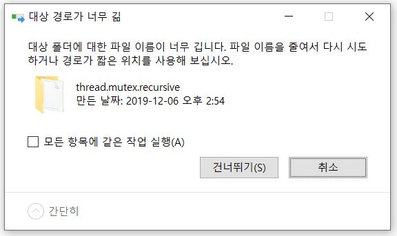 이는 윈도우가 파일이 위치한 전체 파일 경로를 포함하여 260자 이하의 파일명만 허용하기 때문에 발생한 에러입니다.