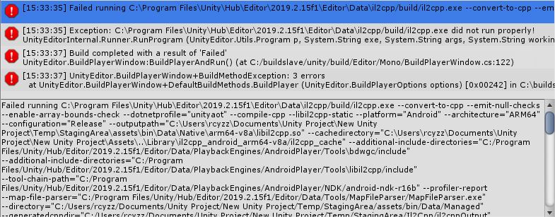 Failed running C:\Program Files\Unity\Hub\Editor\2019.2.15f1\Editor\Data\il2cpp/build/il2cpp.exe ...