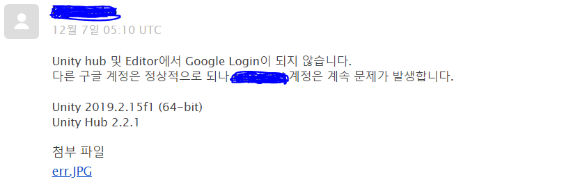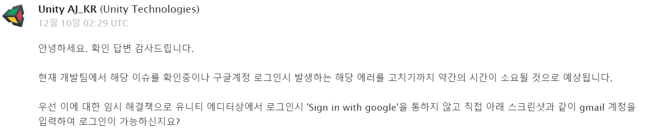 우선 이에 대한 임시 해결책으로 유니티 에디터상에서 로그인시 'Sign in with google'을 통하지 않고 직접 아래 스크린샷과 같이 gmail 계정을 입력하여 로그인이 가능하신지요?"