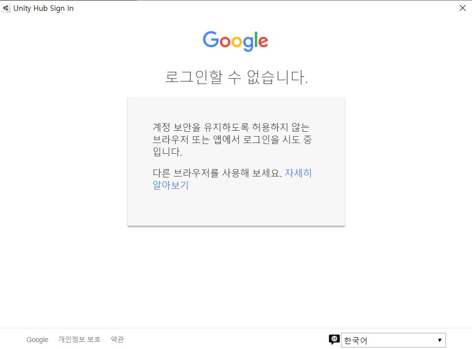 유니티 허브 및 에디터, 구글계정 로그인 오류 (로그인 할 수 없습니다 / 계정 보안) 본문